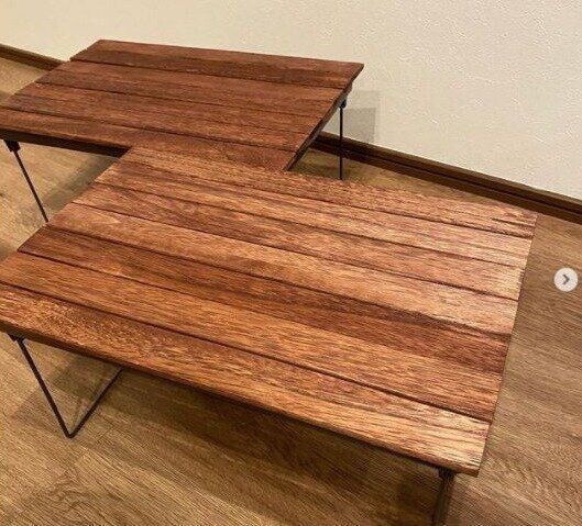 すのこでキャンプ用の机を作成した例です。同じ高さの机が二つあると、つなげて使えるので便利ですね。重ねて棚のようにして使うのもよいアイデア!