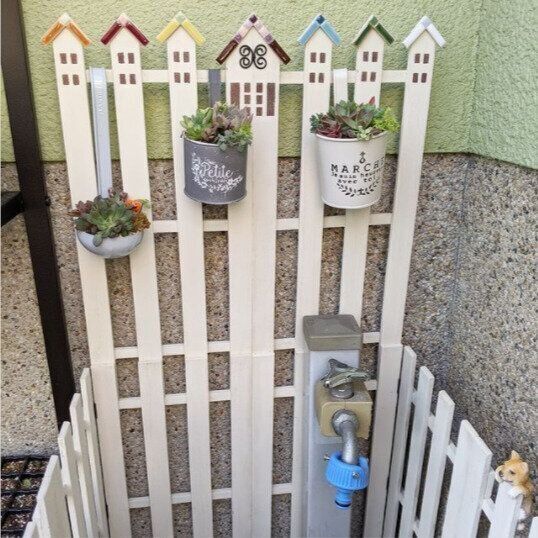 100均のすのこを使って、おうちモチーフの多肉植物置き場をDIYした例です。すのこを使っているとは思えないほど素敵にできていますね。
