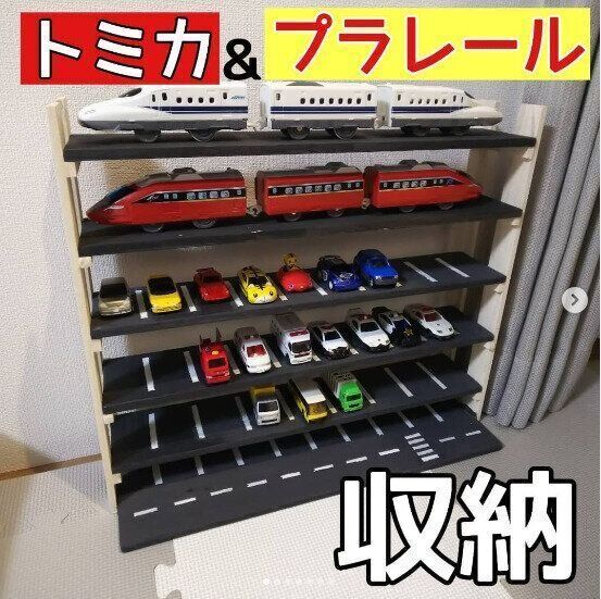 100均のすのこや木材でつくったトミカ&プラレール収納は、小さなお子さんが自分でお片づけしたくなるアイデアが満載です。棚板を立体駐車場風にすることで、お片づけが苦手なお子さんでもきれいに片づけられるようになっています。棚1段でトミカなら10台分、プラレールなら1台分と収納量もあるので、たくさんのトミカやプラレールもすっきり片づきます。