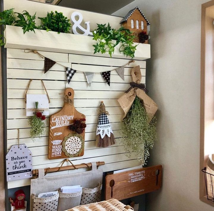 冷蔵庫の側面にすのこでディスプレイラックをつくり、その上にハンドメイドの作品やフェイクグリーンなどを飾ったおしゃれなアイデア。木材×グリーン、ガーランドなども相性ばっちりです。すのこを使ってこだわりのスペースをつくるのも素敵ですね。