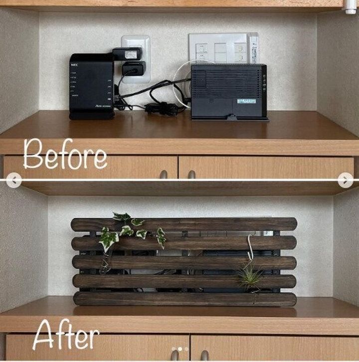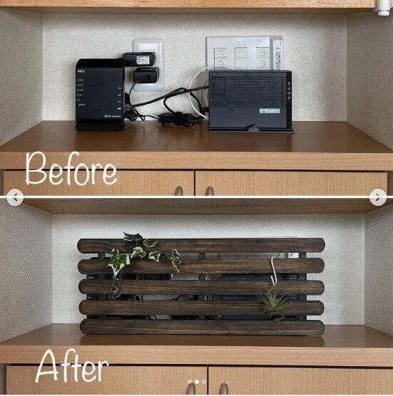 パソコンのルーター類は配線もごちゃごちゃして生活感が出るアイテムですが、100均のすのこを使って目隠しをすればすっきりとした印象に大変身します。すのこなのでルーターの熱がこもる心配もなく、S字フックを使ってちょっとしたディスプレイを楽しむこともできます。