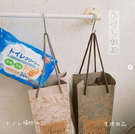 収納するものが多いわりには収納スペースがないトイレ。こちらはキャンドゥで購入したS字フックを活用している例です。紙袋をかければ、トイレの掃除道具や生理用品などを収納することができますね。