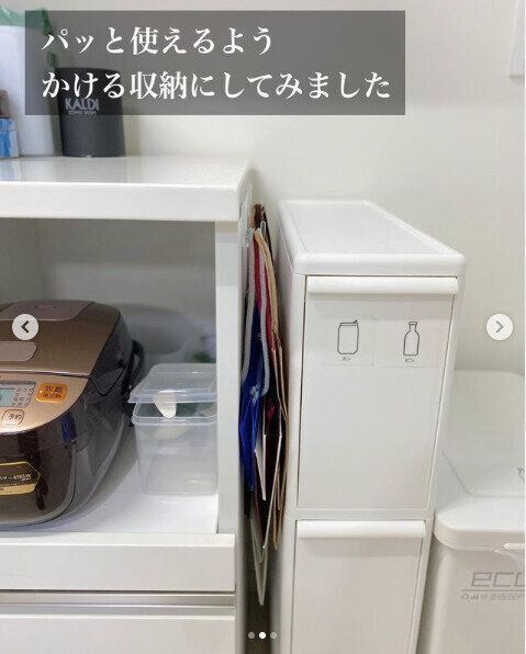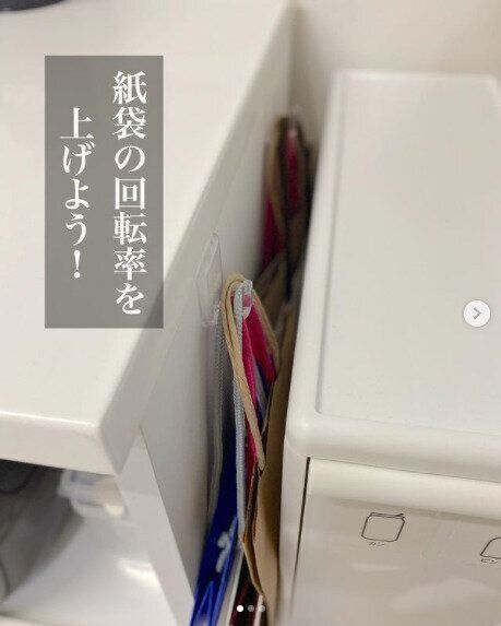こちらではデッドスペースにセリアの粘着フックを使って紙袋を収納しています。フックにかけられる分だけをストックすることで、紙袋の溜めすぎも抑えることができますね。