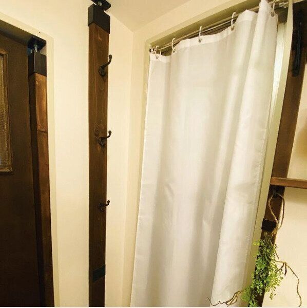 こちらは洗面所にラブリコとセリアのフックを使ってDIYしています。バスタオルや着替えをかけておくのにちょうどよいですね。小さい洗面所にお悩みのかたにはおすすめ!