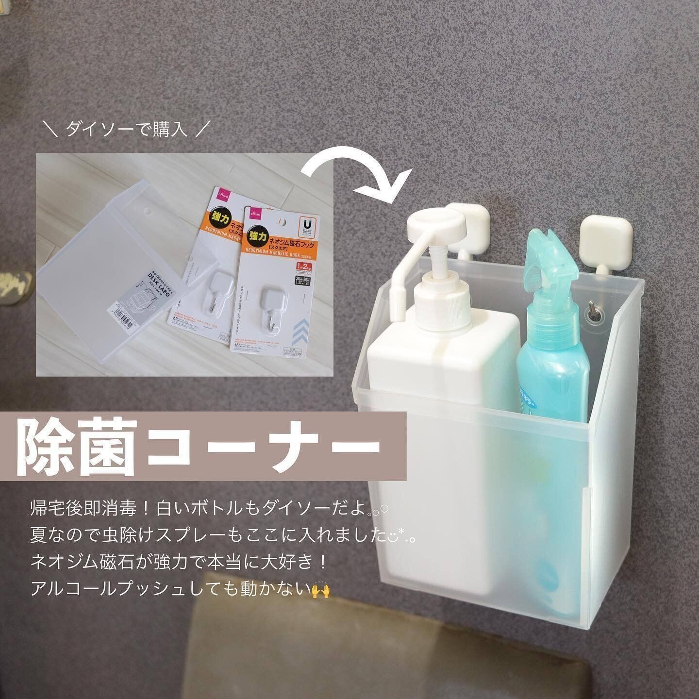 ダイソーの「ネオジム磁石フック」を活用した、玄関収納・除菌コーナーづくりのアイデアです。フックをドアにぴたっとくっつけて、ケースにスプレーボトルをイン。帰宅後すぐにアルコールをプッシュできるので、気分よくおうちに入れそうですね。