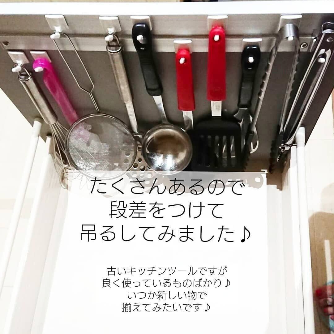 「Pitacco くりぴた粘着フック ミニワイド」を活用した、キッチンツールの収納アイデアです。調理が楽しく、使いやすくなりそうな素敵な活用方法ですね!「くりぴた粘着フック」は種類が豊富なので、ダイソーの公式サイトでもぜひチェックしてみてください。