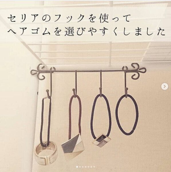 こちらはセリアの4連フックでヘアゴムを吊し収納しています。こまごまとしたものもフックを使って収納すると使いやすく片づけやすいですよね。