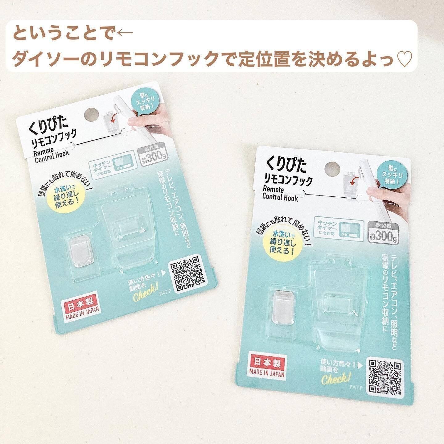 ダイソーで要チェックの「くりぴたリモコンフック」。テレビにエアコン、照明類など、たくさん&かさばりがちなリモコンの収納にいかがでしょうか。リモコンの定位置が決まれば、スッキリ片づくだけでなく、その都度探す手間も省けそうです。