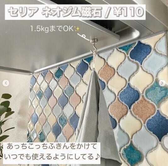 キッチンでふきんやキッチンツールを吊り下げるのに大活躍するのがセリアのネオジム磁石のフック。こちらは110円の商品です。1.5kgまで吊り下げることができるので、いろいろ使えそうですね。