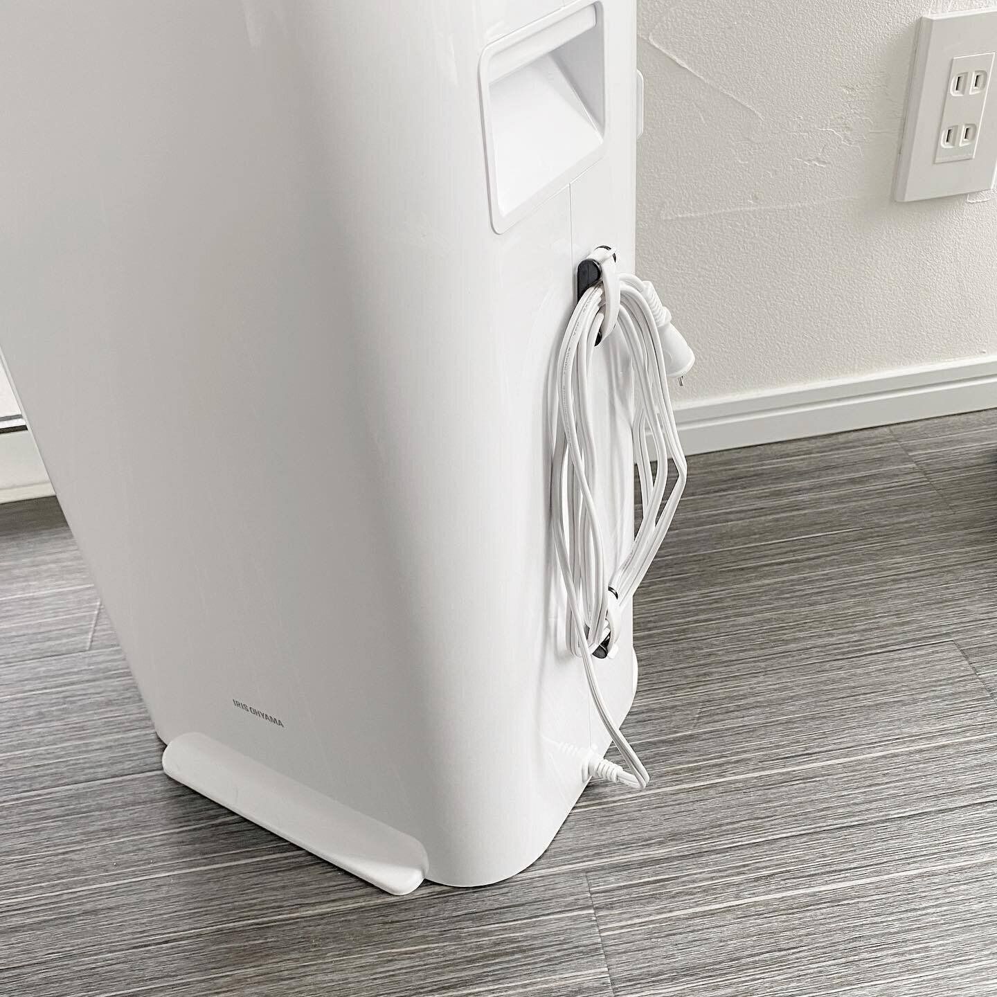 「粘着テープ開閉フック」を使った、加湿器のコード収納のアイデアです。商品パッケージによると、耐荷重は約500g。コードの収納にぴったりのアイテムです。家電を使わないときもすっきりまとまり、使い勝手もよさそうですね。