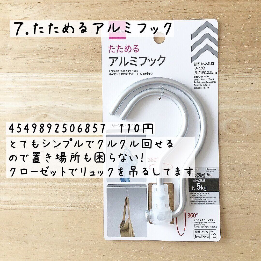 コンパクトにたたんで持ち運びもOKな、ダイソーの「たためるアルミフック」。お出かけ用の持ち物に加えれば、行く先々でカバンや小物類の収納に重宝しそうですね。おうちのクローゼットでの、吊るす収納にもぴったりです。