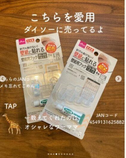 ダイソーでゲットできるこちらの壁紙用フック。針穴をあけることなく、壁紙を貼りつけることができます。4個入りなので、いろいろな場所で使えそうですね。