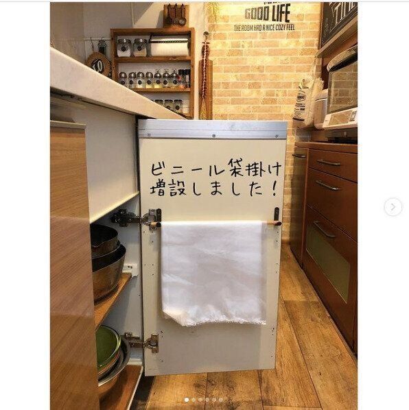 こちらは、セリアのフックに丸棒をかけただけの超簡単DIY!ビニール袋をかけるのにちょうどよいラックは、キッチンにおすすめですよ♪