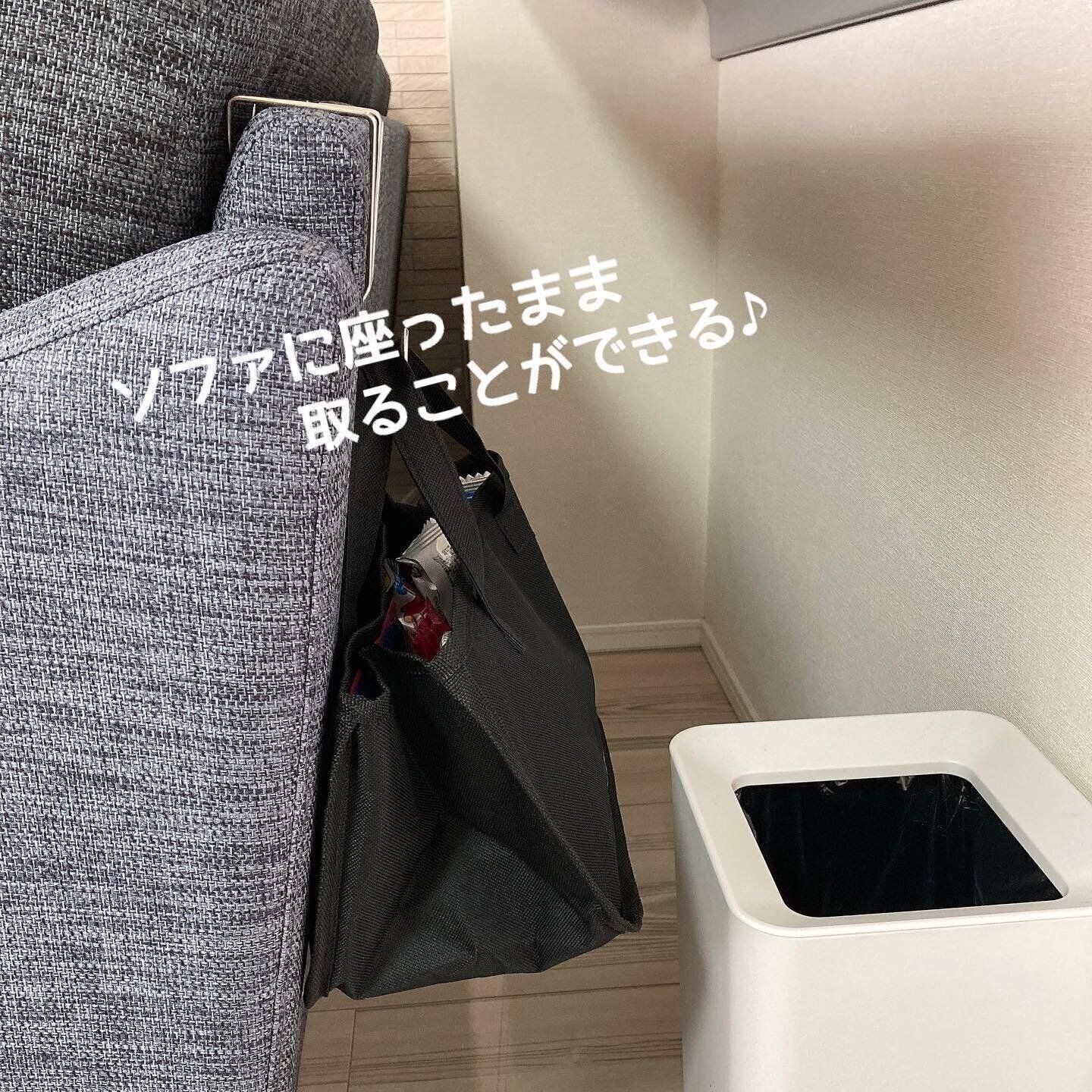 キャンドゥの「バススポンジホルダー」をフックとして活用した素敵なアイデアです。ホルダーを逆にしてソファに引っかけると、座ったままものを取れる便利な収納に!バススポンジホルダーの耐荷重量は約1kgです。