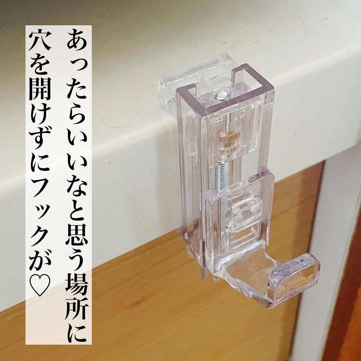 取りつけ場所に合わせて調整できる「縦にも横にもはさめるかもいフック」。穴をあけず、ラックや棚板など、フックがほしいところに取りつけられるのがポイントです。耐荷重量は約1kgで、キャンドゥやセリアなどでも販売されているようです!