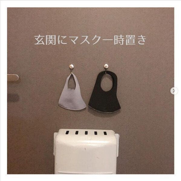 こちらでは、セリアの強力磁石スチールフックを使って、玄関にマスクの一時置き場をつくっています。磁石スチールフックは跡が残らないので賃貸住みのかたにもおすすめです。