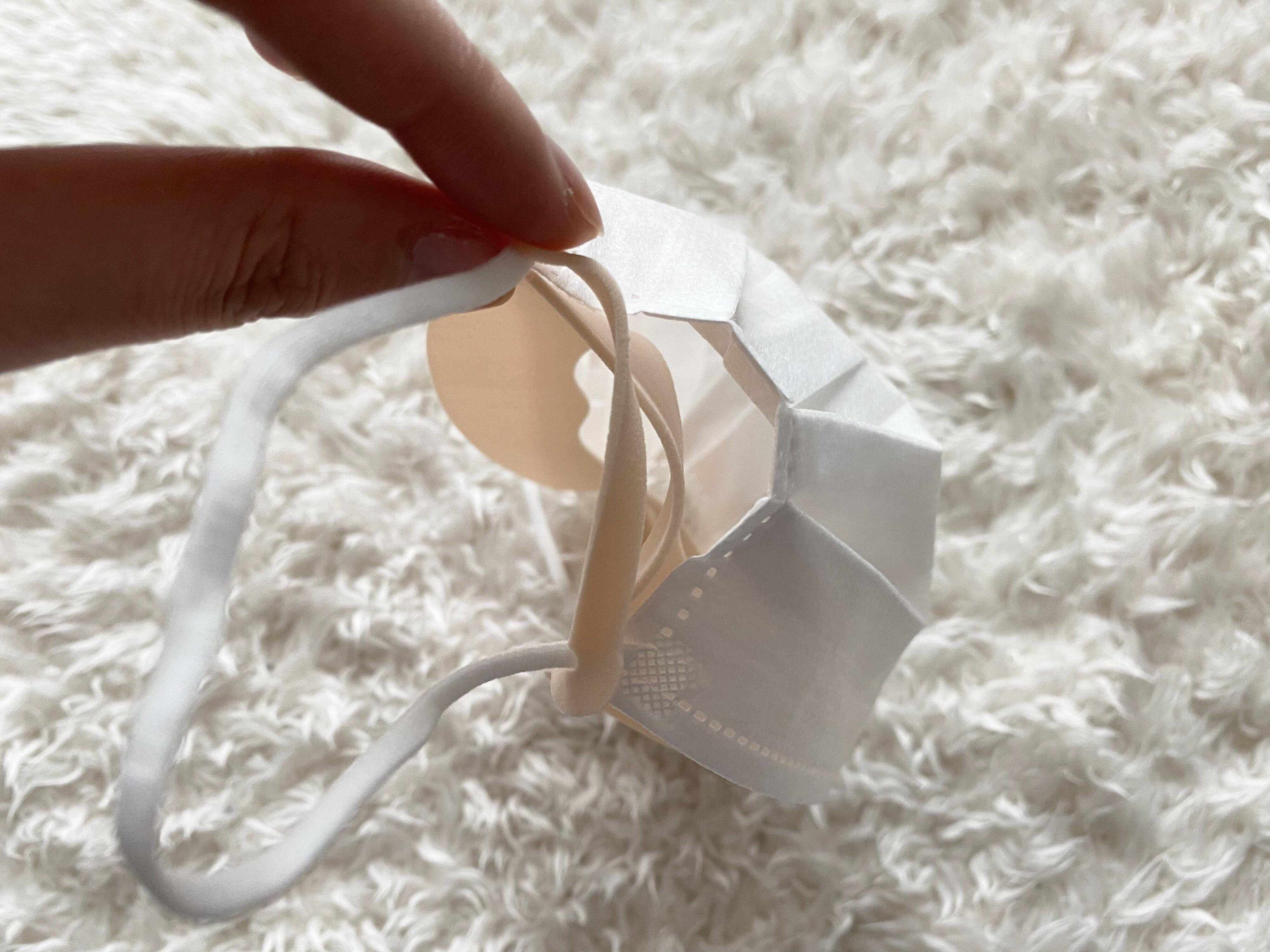 不織布のプリーツマスクに装着してみました。装着方法は、耳にかける紐の部分をインターパッドの穴に通すだけ。