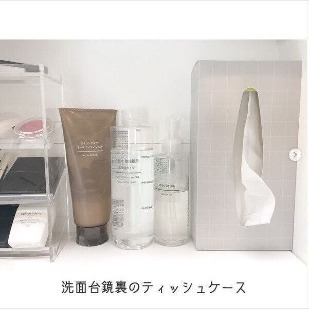 キャンドゥの組み立て式ティッシュケースは余分な装飾やムダな余白がないシンプルなケースなので、洗面台鏡裏の収納スペースにもすっきりと入れておくことが可能です。これなら収納スペースもごちゃつくことなくキレイに見えます。