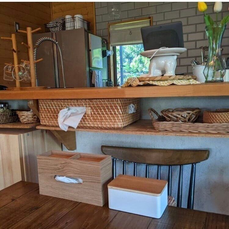 こちらの木製のティッシュケースはダイソーの商品です。330円とは思えないおしゃれさと、上に小物が置ける機能性で大人気の商品です。