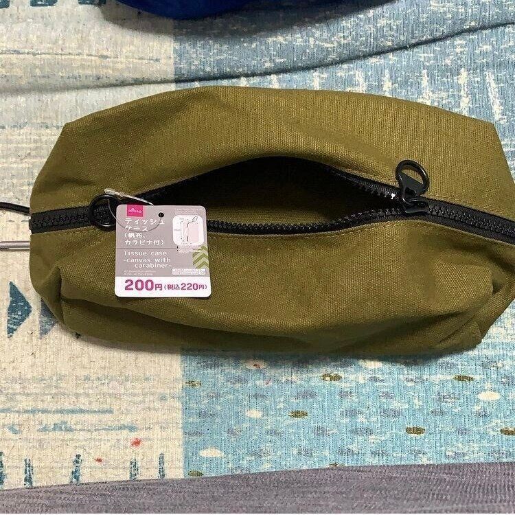 こちらはダイソーのアウトドア用品にあるティッシュケース。カラビナつきで便利です。アウトドアだけでなく、車などでも使いやすそうですね。