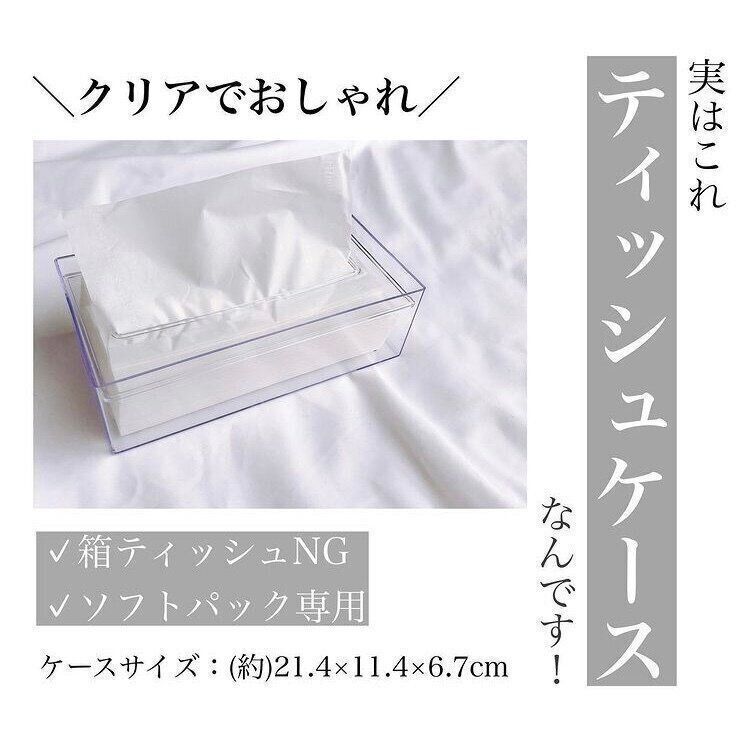 透明でオシャレなこちらもセリアで販売されているティッシュケースなんです。オススメの使い方はソフトパックのティッシュの中身をそのままセットするだけ。天板をはずすだけで簡単に詰め替え可能で、残量も一目でわかります。