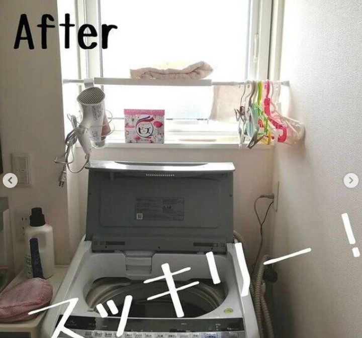 ごちゃごちゃしがちな洗濯機まわりは、つっぱり棒と、つっぱり棒に取りつけられる棚を組み合わせて、収納ラックをDIY。洗濯ラックを設置するより圧迫感がなく、小物もスッキリ整理整頓できます。