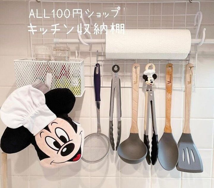 キッチン収納のDIYアイデアです。アイテムが多いキッチンも、よく使うアイテムがひとつに集まっていたら料理の時短にもなりますね。DIYなので、フックの数を増やしたり、収納カゴを増やしたりできるのがDIYの魅力ですね。