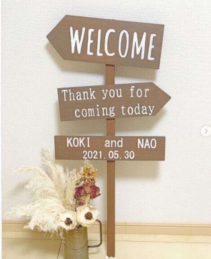 DIY好きはダイソーで販売されている、板・棒・ペンキ・ハケ・グルーガンを使った、ウェルカムサイン作りに挑戦してみて。置いているだけでかわいくて、写真映えすること間違いなし。結婚式のウェルカムスペースや、前撮りで使っている人も多いそうですよ。