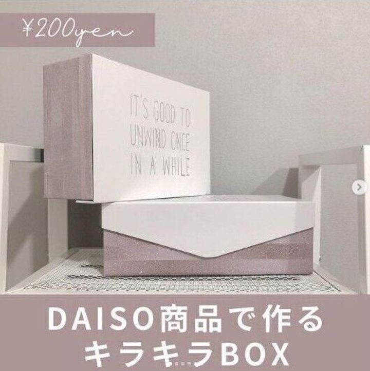 さまざまなサイズがあるダイソーのフタ付き紙ボックスをダイソーのキラキラマステを使い、キラキラボックスにアレンジした例です。黒と白のシンプルなボックスも、マステひとつでおしゃれに生まれ変わりますね。