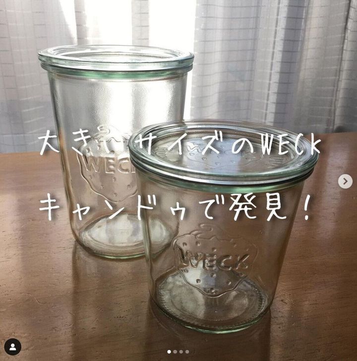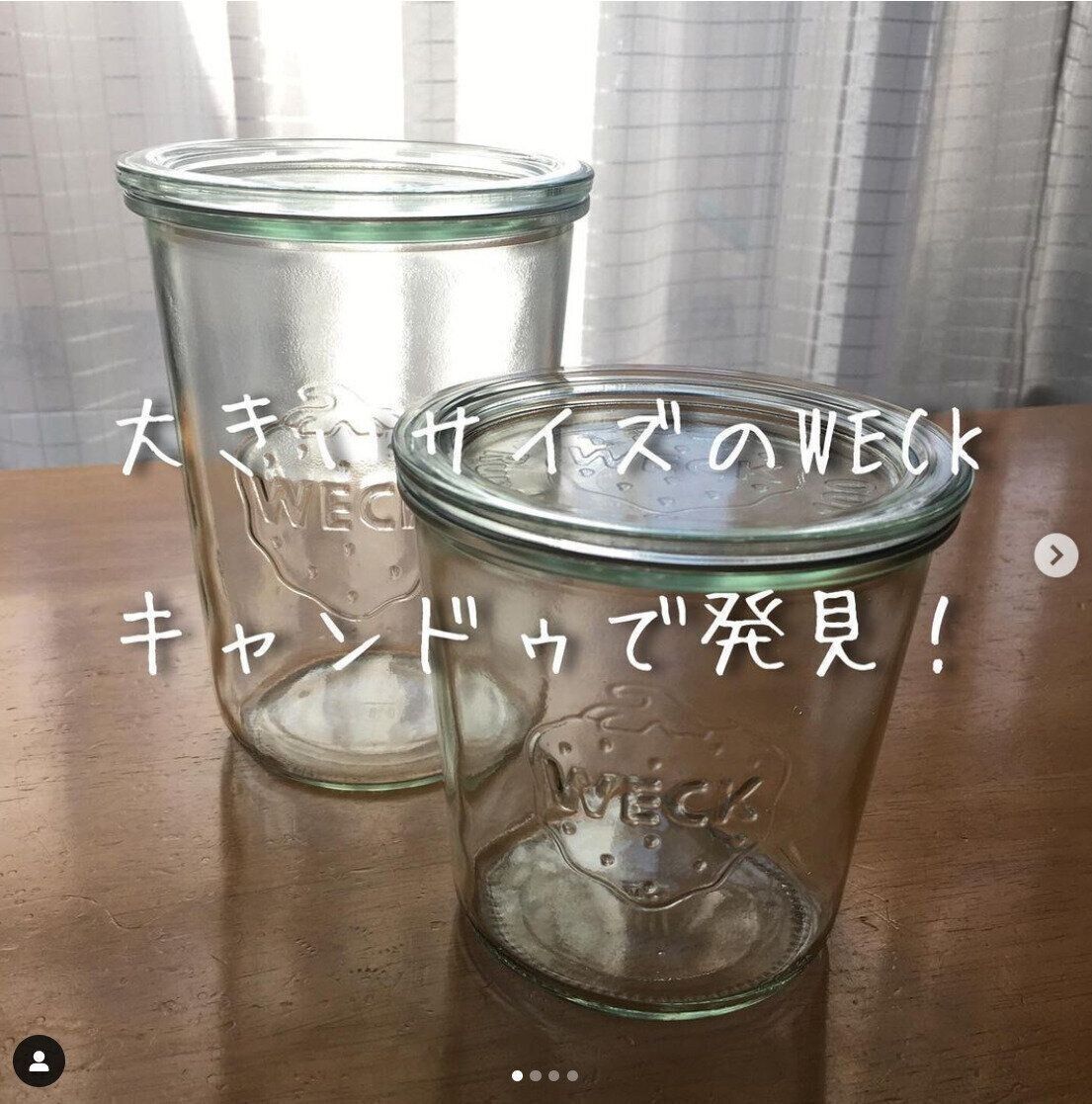 キャンドゥにはたっぷり入る大きいサイズのWECKも!お値段は850mlタイプが550円、580mlタイプが440円です。ガラス製で形状はストンとしていて、すっきりしています。お値段ラベルもきれいにはがれるので安心。どれもかわいいので、種類別に集めたくなりますね。
