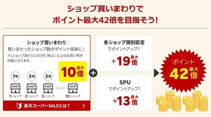 ・ショップの買い回りやポイントアップ商品との組み合わせで最大45.5倍のポイントがもらえる