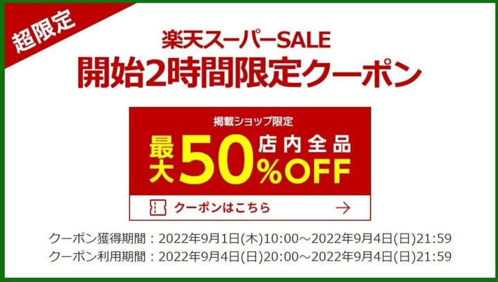 楽天スーパーセール期間前から対象ショップ限定で最大2000円OFFのクーポンが入手できるページも公開されるので、目当ての商品を扱うショップがないか必ずチェックしましょう。他にもセール開始2時間限定で、対象ショップの店内の全商品が最大50%オフになる超お得なクーポンも登場します。