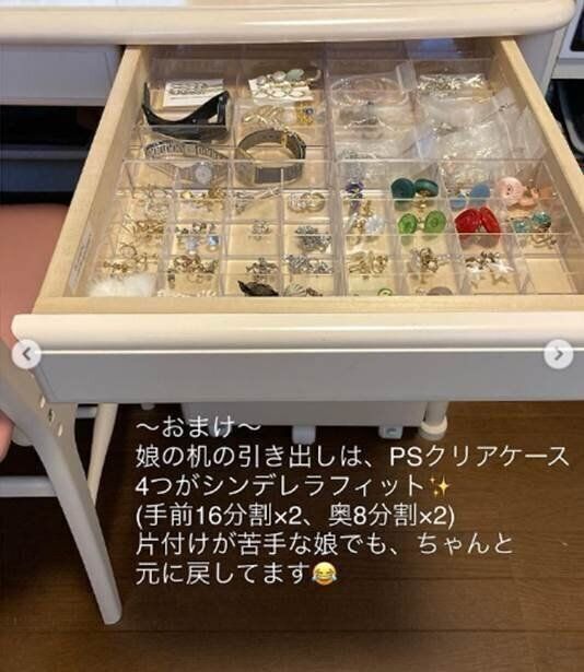 お気に入りのアクセサリーがこんな風に美しく並んでいるだけで気分があがりますよね。PSクリアケースを使ってアクセサリーを見事に収納したアイデア。アクセサリーの大きさに合わせて、16分割と8分割の4つのPSクリアケースを使用しています。引き出しの中で見事にシンデレラフィットしていますね!