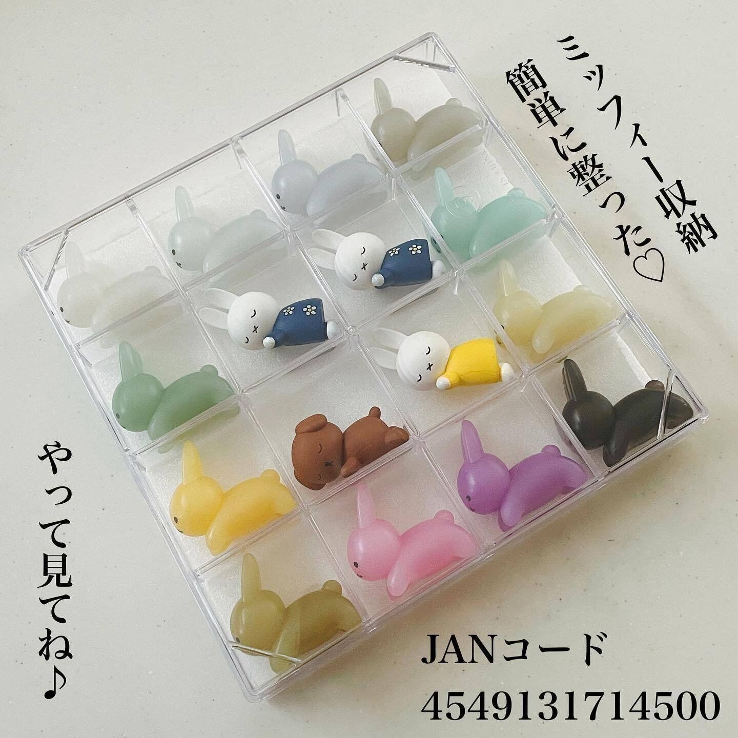 16分割されたPSクリアケースにミッフィーのマスコットを陳列するアイデア。お気に入りのキャラクターをかわいく飾ることができます。背面をボードで補強すれば、立てて飾れるディスプレイ収納アイテムのできあがりです。