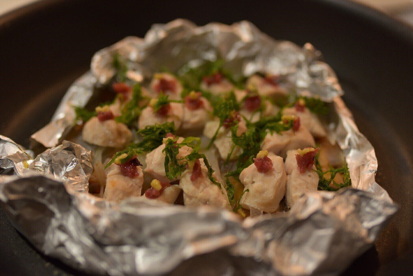 ホイルに包んでフライパンの上で蒸し焼きにします。ゆっくりと加熱することで、パサつきを防ぎ、ふっくらと仕上げます。梅とワサビの組み合わせが、春らしさ満点です。