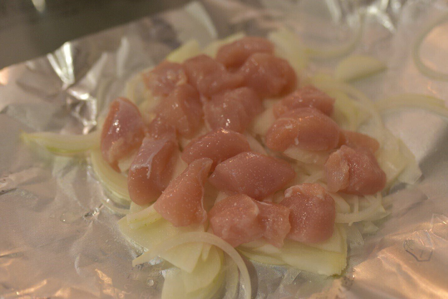 3.たまねぎの上にささみを並べ、塩をふります。