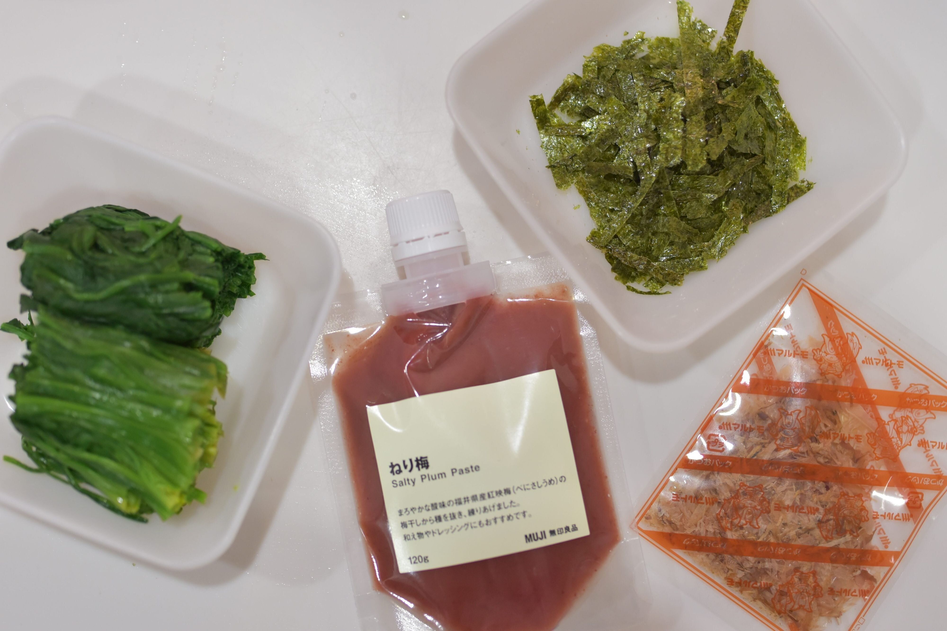 材料は、ゆでたほうれん草と、ねり梅、かつお節、刻みのりだけ。それぞれをお好みの量混ぜ合わせただけで完成!