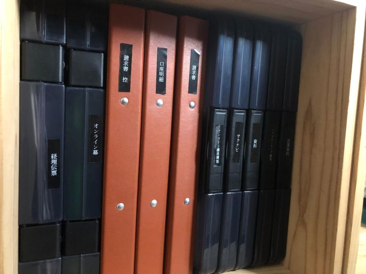 ラベルシールを黒テープで作成して貼ってみました。表紙はファイルの中央ではなく、あえてずらして貼ることでおしゃれ度アップ!