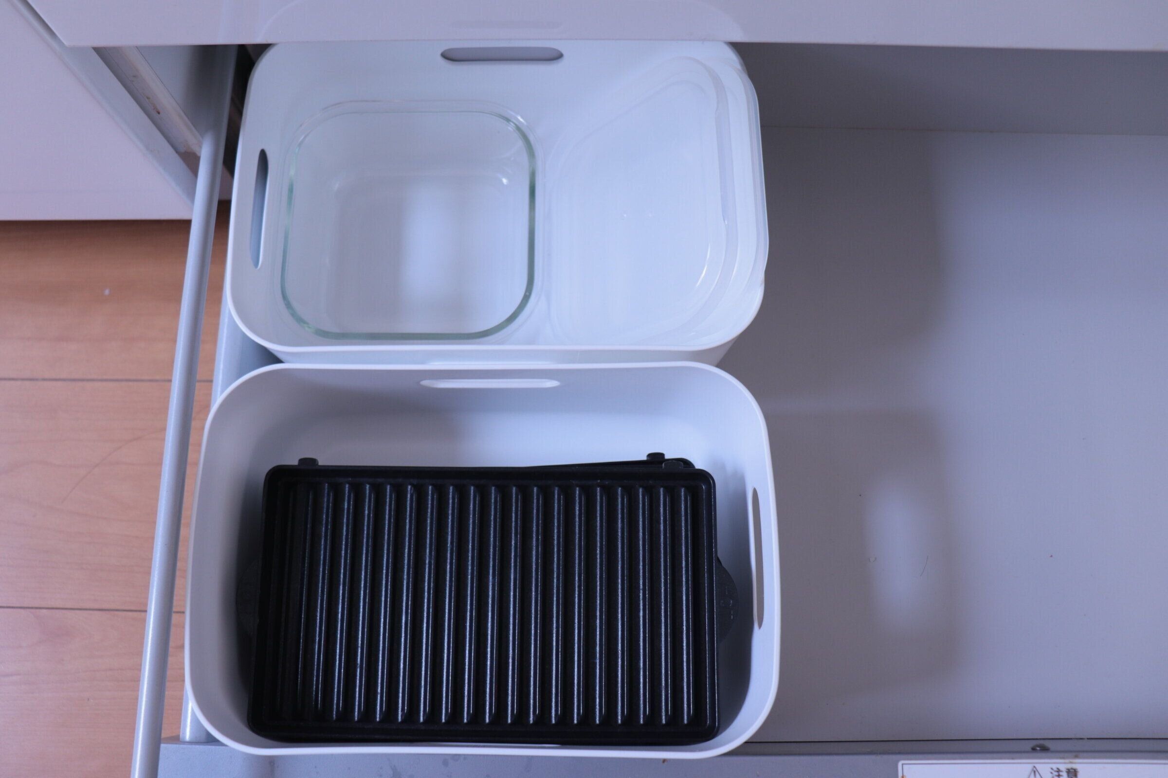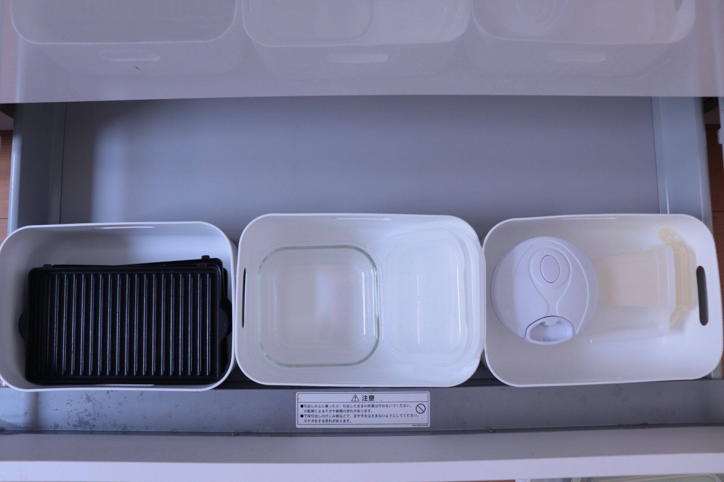 お弁当箱や水筒などこまめに使うけどしまっておきたいものを我が家はキッチンのいちばん下の引き出しに収納しています。