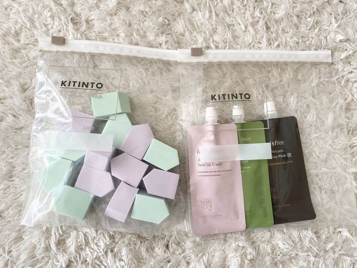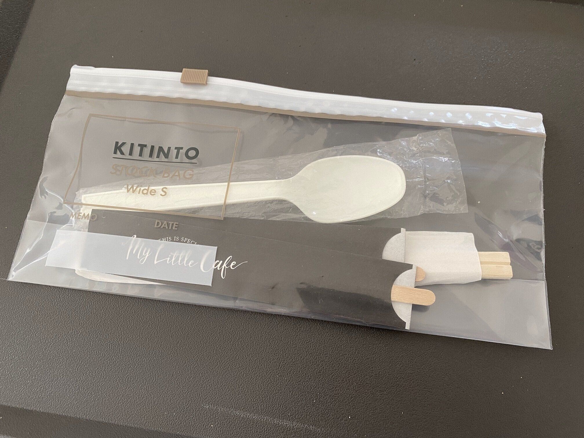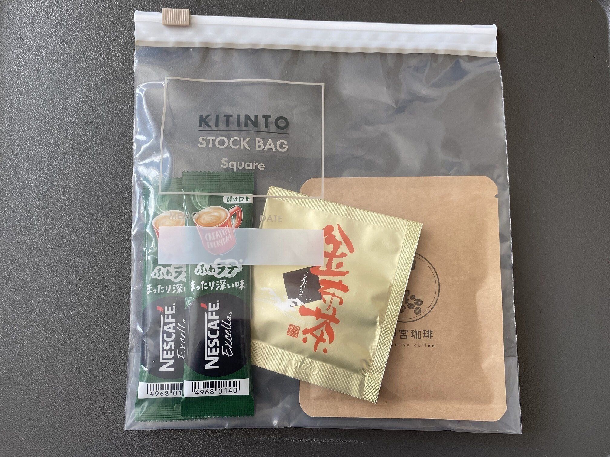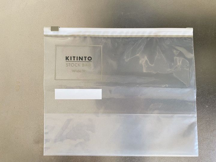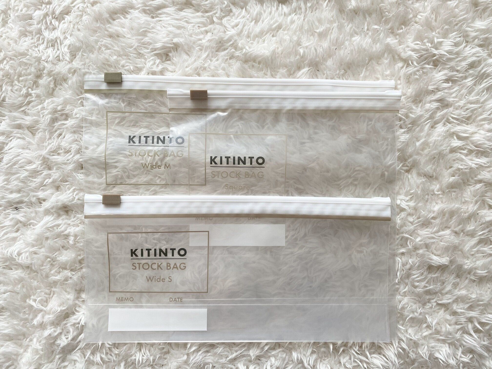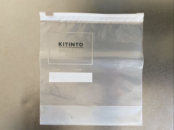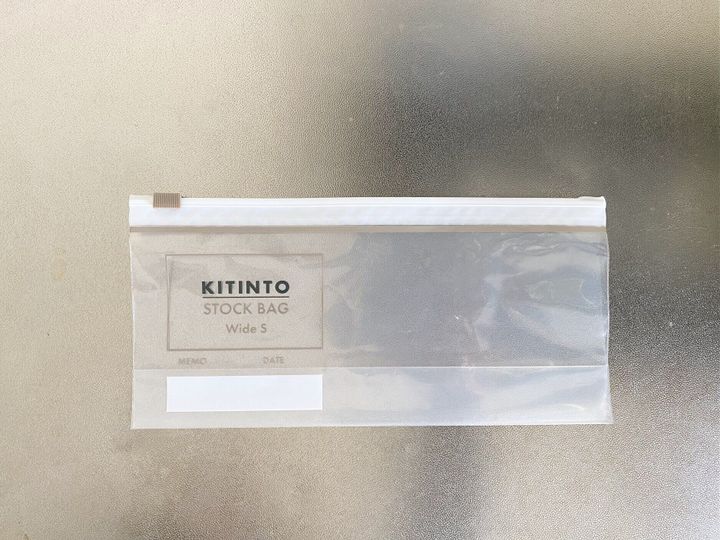 今回ご紹介するのは、3COINSのストックバッグ。くすみベージュのカラーがユニークですね。KITINTOと書かれた黒文字ロゴと白いメモ書き可能な部分も魅力的。