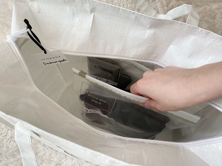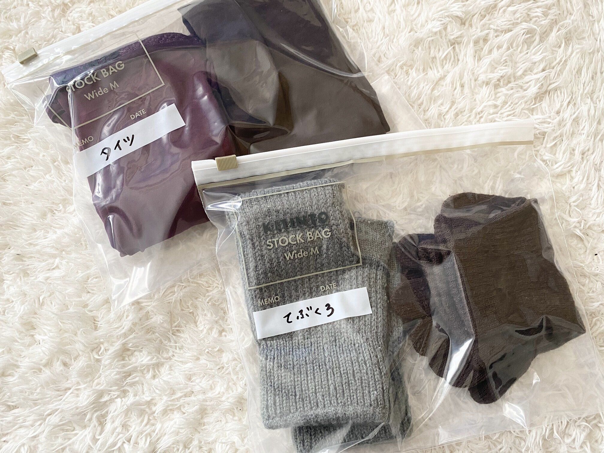 また、このサイズ感ですとクローゼットの整理にも使えます。衣替えの時期ならシーズンオフになった手袋やマフラー、タイツなど冬物を分けながら入れていき保管袋へ。タイツは4足分、手袋とニット帽なら1セット入りますよ。そのほか、お子様の水着セットやサイズアウト服にも使えます。