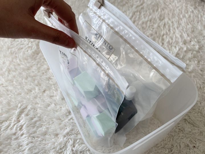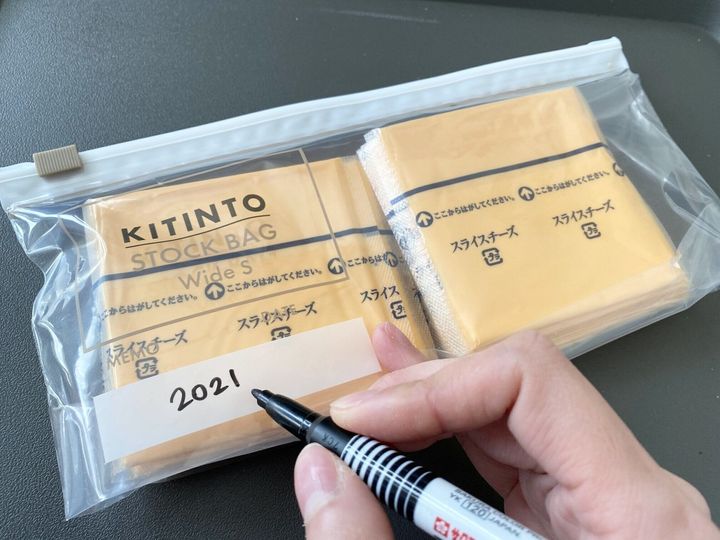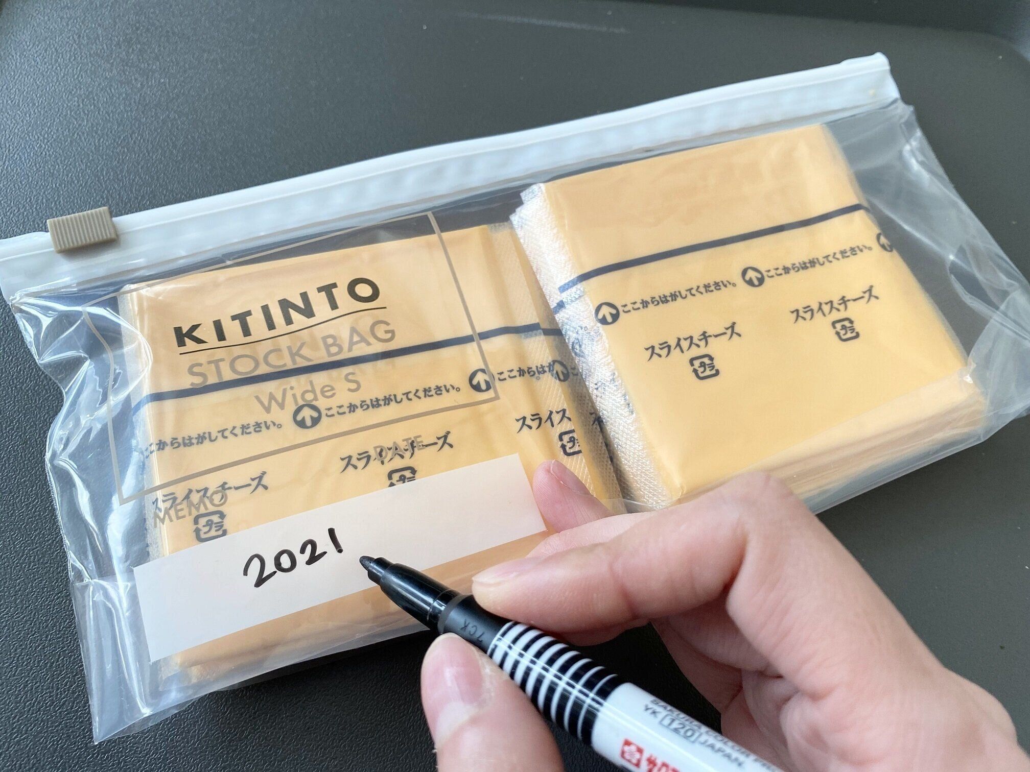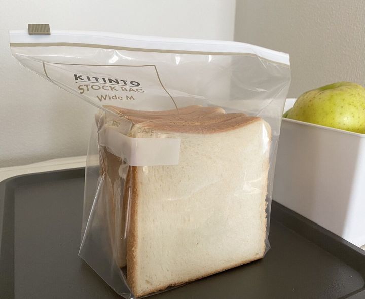 食事の作り置きや事前に野菜を切っておく切り分け保管などにも便利。スライド式なので急いでいる調理中も簡単開け閉めできますよ。サイズ感は食パン6枚切りがぴったり入りました。マチがあるので自立もするのが、いいところです。