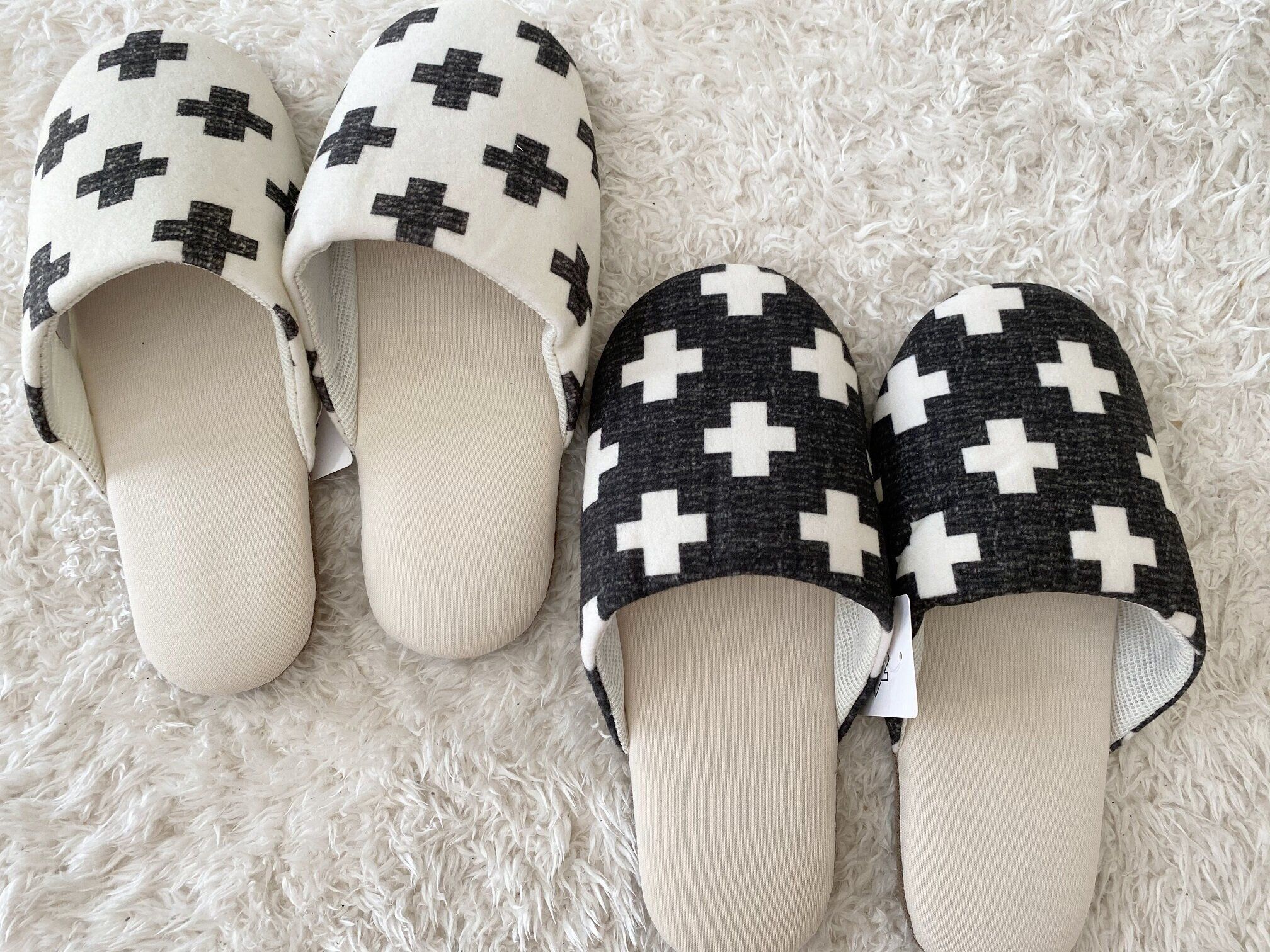 写真は「フィットスリッパ クロス」で、価格は各110円。軽くて履きやすく、モノトーンだけど柄はポップなところがお気に入りです。
