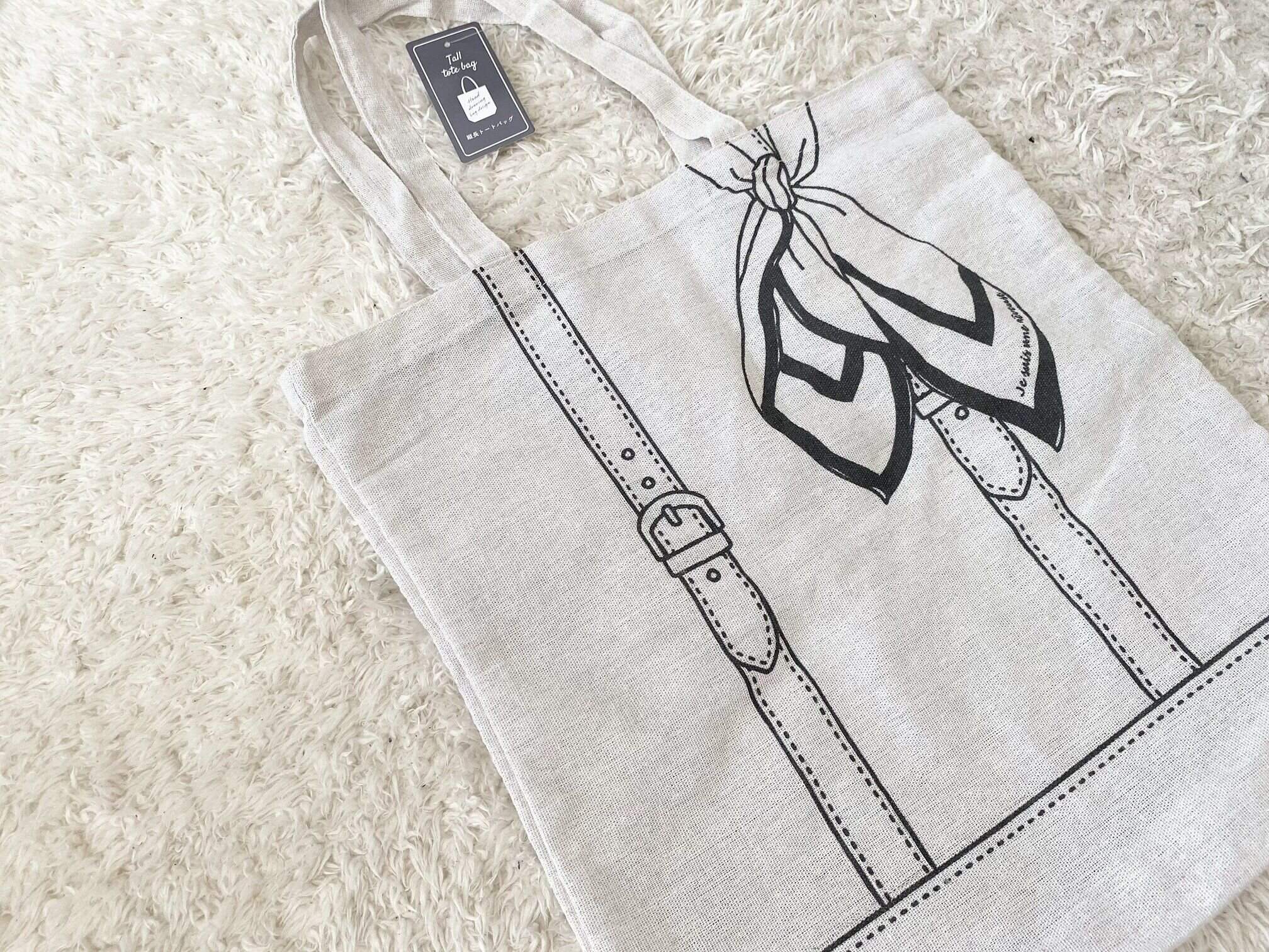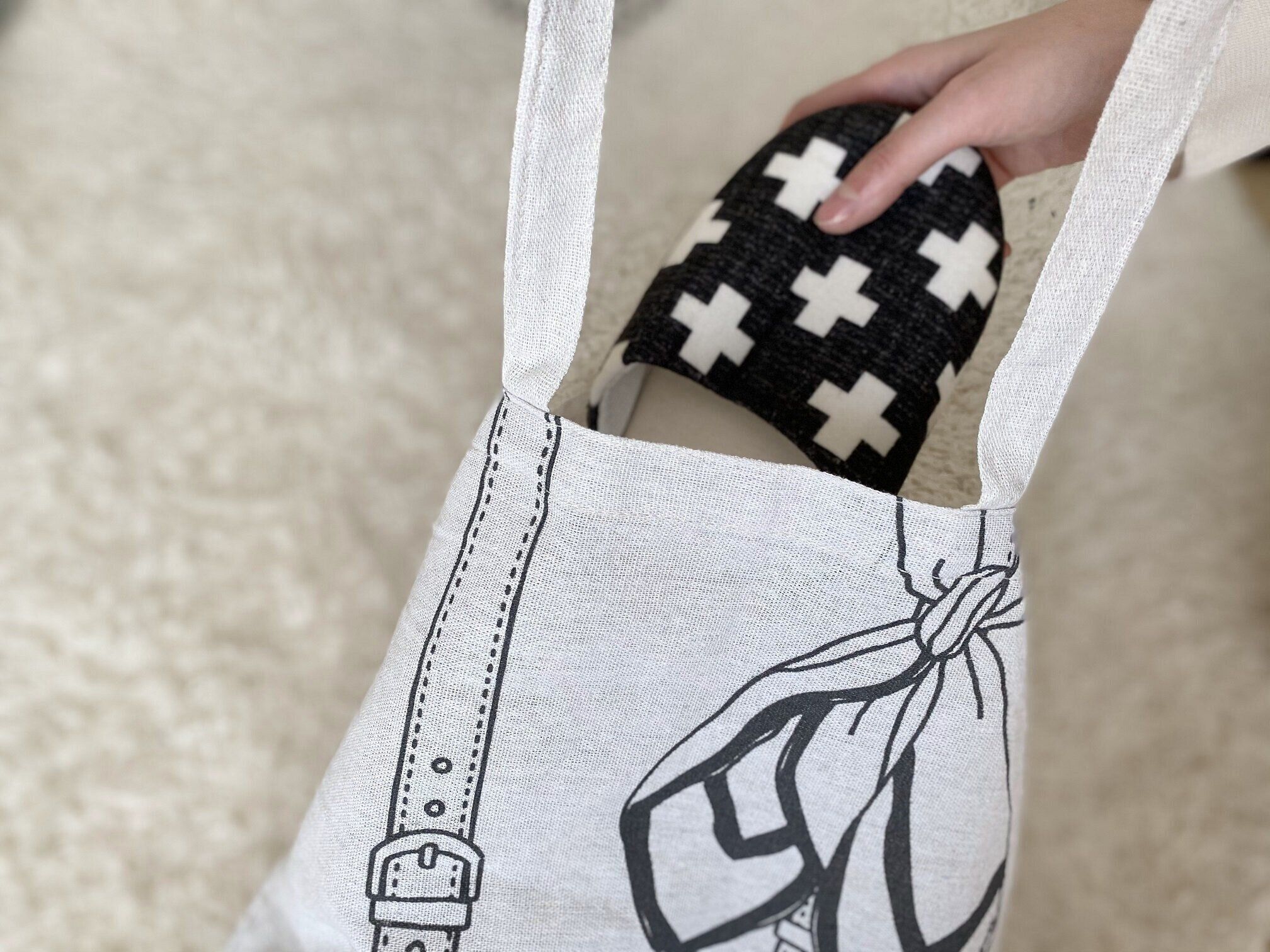 「なんにも床置きしたくない」という方は、掛ける収納もおすすめ。お客様用など頻度の低いスリッパをバッグに入れて管理しましょう。写真のものもまたセリアで、商品名は「縦長トートバッグ 手書き風バッグ柄」。ポリエステル、綿素材でイラストがかわいいバッグで、価格は110円です。