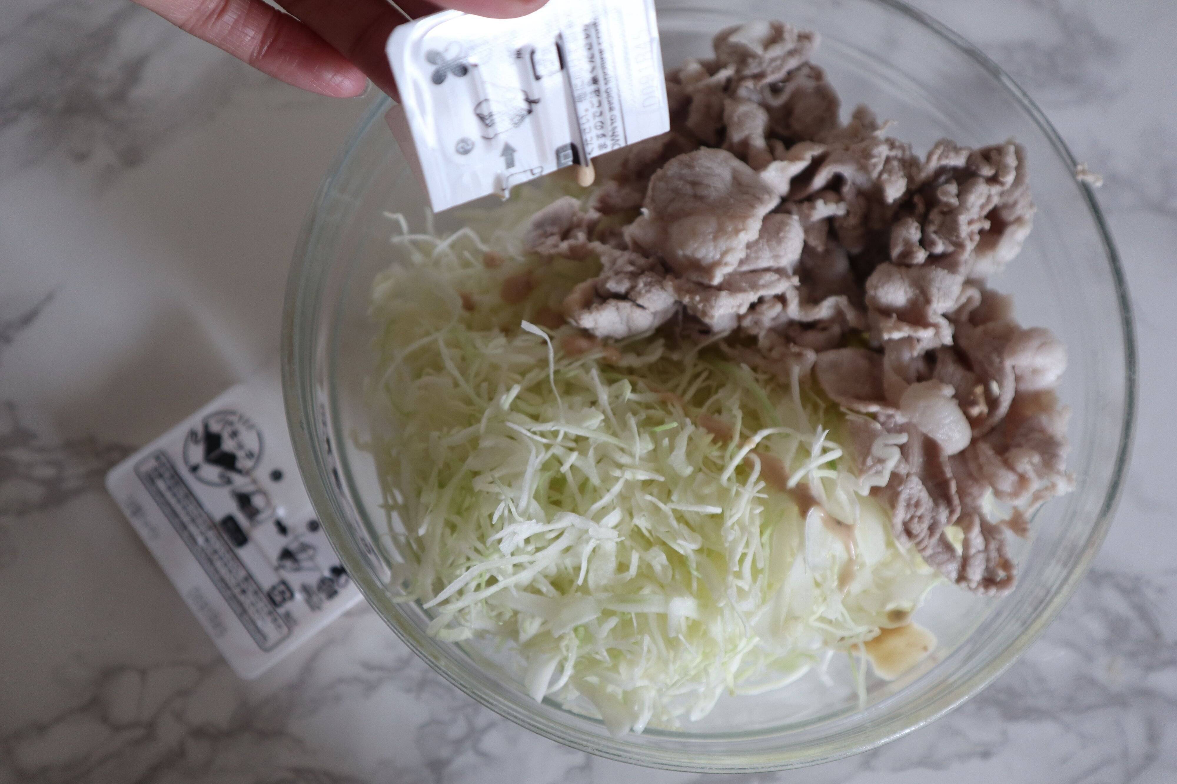 まず、キャベツだけでは味気ないので豚しゃぶ200gを加えて、うま塩キャベツの素を2個とマヨネーズ大さじ2を加えて和えます。