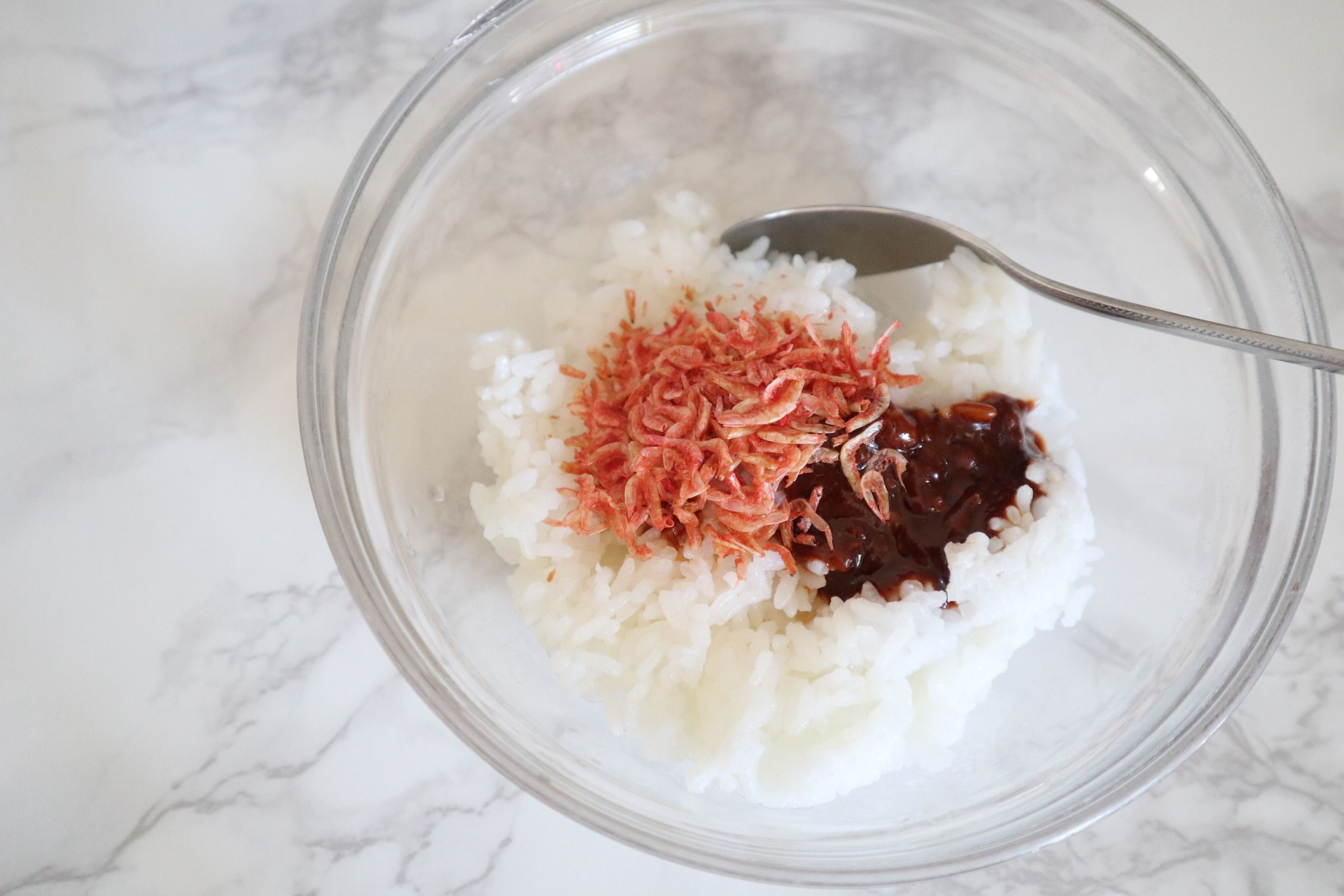 1.ボウルにごはん200g、桜エビ大さじ1、たれ1袋を入れて混ぜる。
