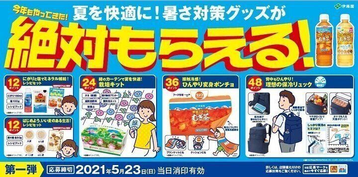 「健康ミネラルむぎ茶」の応募マークを集めて応募すると、夏を快適に過ごす!“暑さ対策グッズ”が絶対にもらえるキャンペーン実施中。「背中もひんやり!理想の保冷リュック」「接触冷感!ひんやり変身ポンチョ」など、楽しく夏を快適に過ごせる景品がいろいろ。キャンペーンは5月23日(日)当日消印まで!