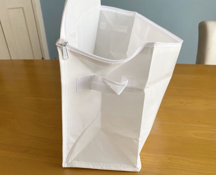 シーズンオフの服の管理やお子さまのサイズアウトなど、今はあまり使わないというモノは収納バッグで管理しましょう。今回使ったのは、キャンドゥで購入した「収納整理バッグ 縦置き」。価格は110円です。
