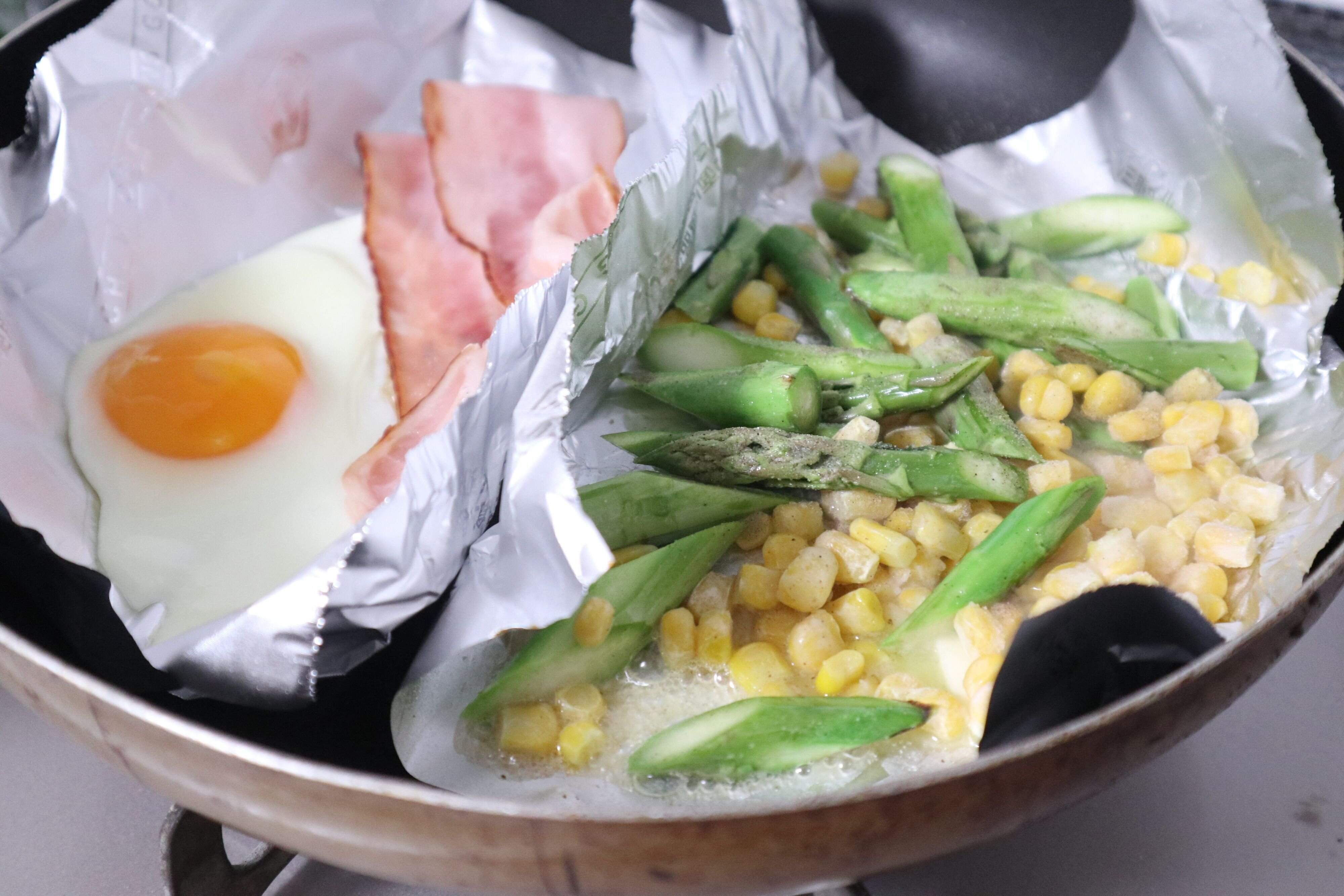 このアルミホイルはくっつきにくいので、ベーコンエッグは油をひかなくてOK。カロリーもオフできます!その横で、バタートーストもいっしょに焼いています。