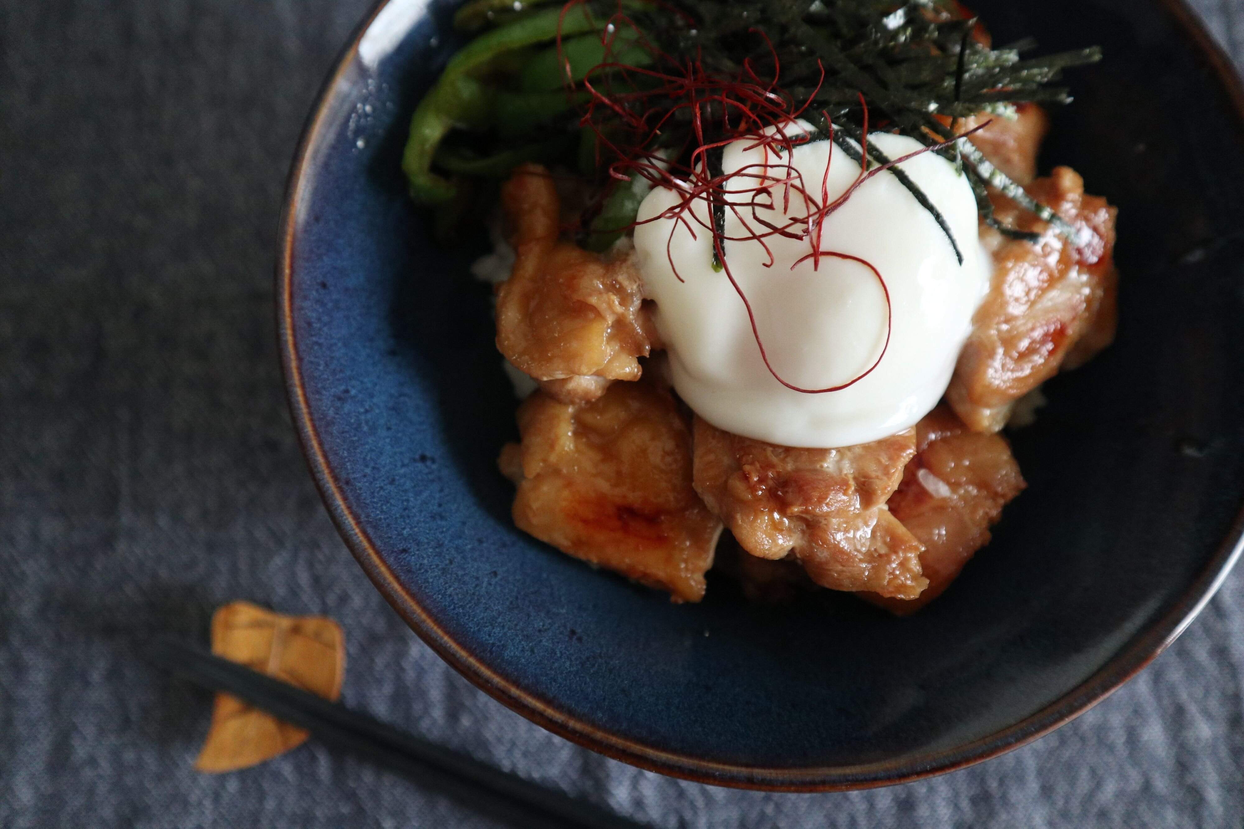 照り焼きチキンをつくったとアルミホイルをはずして、そのフライパンでピーマンのきんぴらを炒めます。丼ぶりに照り焼きチキン、きんぴら、温玉、刻みをのせれば一品完成。作業がスムーズです。